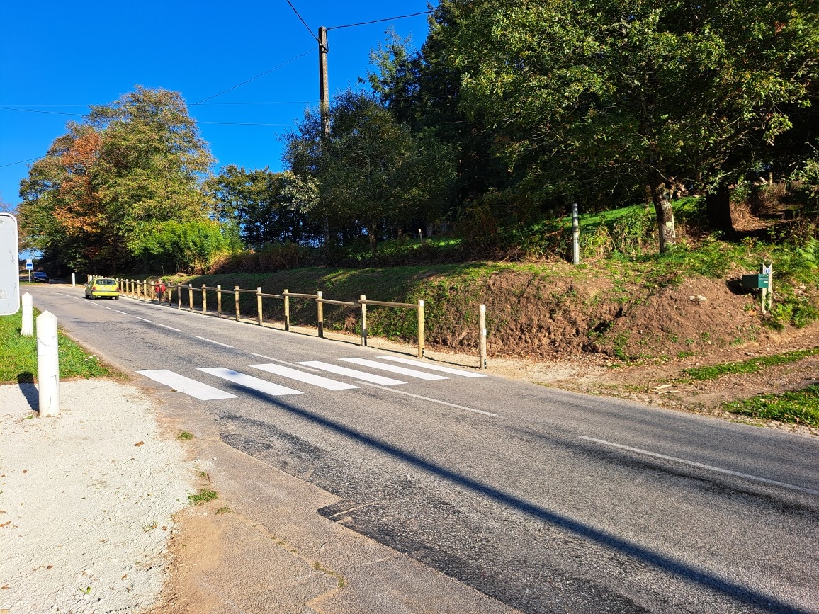 La peinture matérialisant le passage piéton a pu être réalisée et l’équipe des services techniques a, par la suite, effectué la protection du cheminement piéton en installant des barrières en bois permettant le passage sécurisé des enfants descendant du car scolaire dans le délaissé routier au-dessus du virage.
