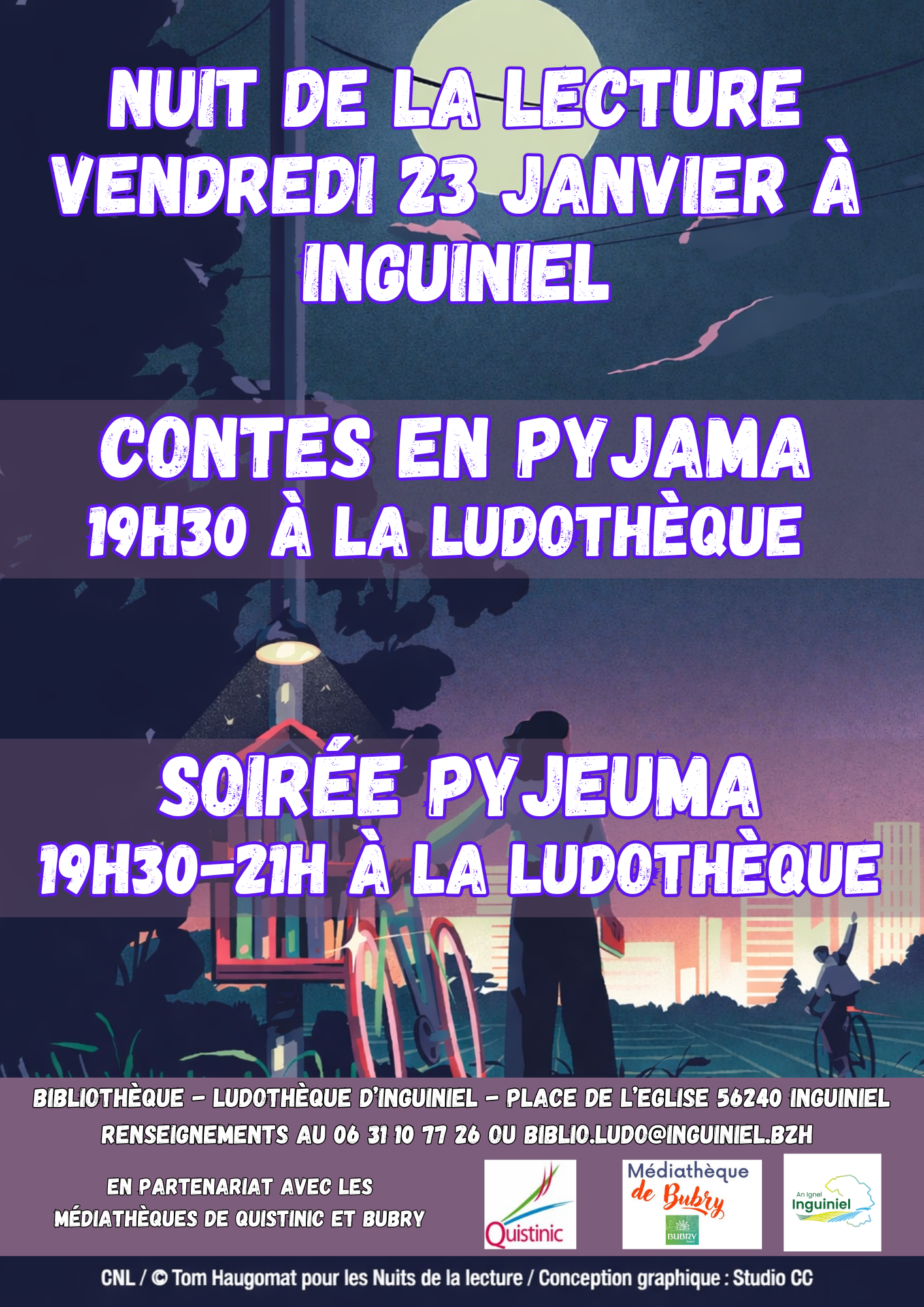 Organisée par les médiathèques de Quistinic, Bubry et Inguiniel. Cette année à Inguiniel le vendredi 23 janvier, de 19h30 à 21h. Contes en pyjama Renseignements au 06 31 10 77 26 ou biblio.ludo@inguiniel.bzh