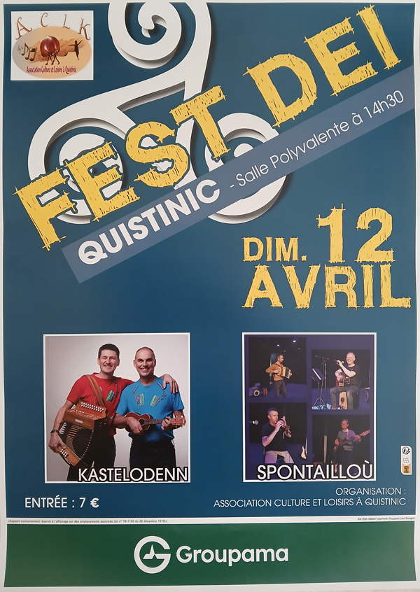 Fest Dei Dimanche 12 avril à 14 h 30, salle polyvalente de Quistinic Avec les groupes : Kastelodenn et Spontailloù Entrée : 7€ Organisé par l'association culture et loisirs à …
